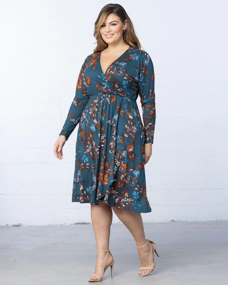 A must-have in your wardrobe, the Aster Faux Wrap Dress provides the timeless charm of a traditional wrap dress. This classic plus size faux wrap dress gracefully accentuates your curves and creates a sophisticated hourglass silhouette. This jesery midi dress cinches your waist with elastic gathering, while a V-neck and fitted long sleeves make this plus size dress incredibly versatile. Effortlessly transitions from the workplace to the weekend and can be dressed up for evening. Exclusively designed for curvier figures, available in plus sizes (0x-5x).