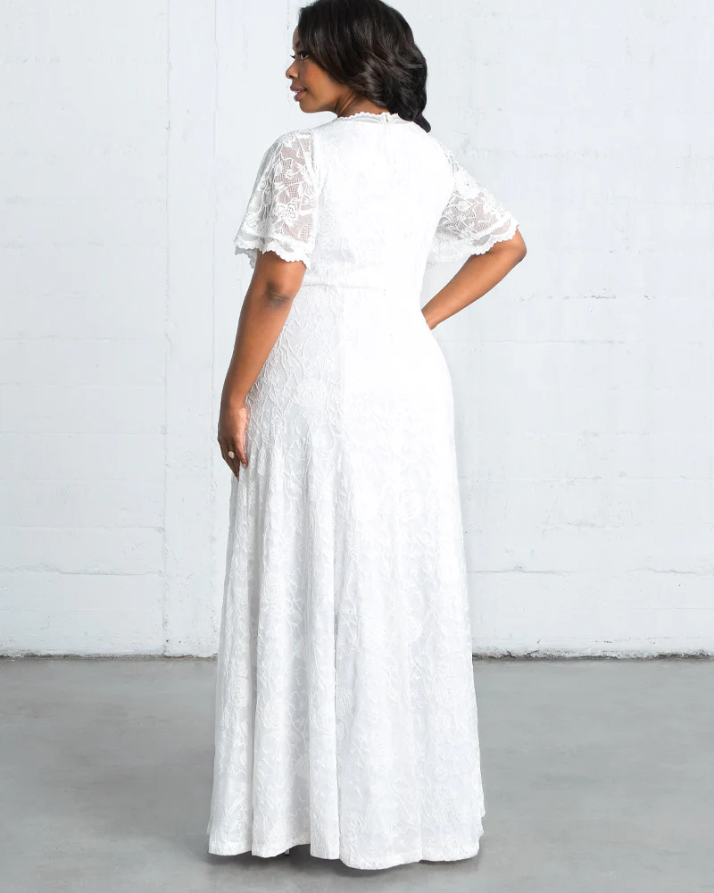 You'll be filled with joy on your special day in our Blissful Lace Wedding Gown. Stunning floral lace is timeless, elegant, and eye-catching. Designed with flirty boho sleeves, a modest V-neckline, and flattering princess seams on the front and back. A zipper makes this gown easy to get in and out of with ease. Made exclusively in women's plus sizes.