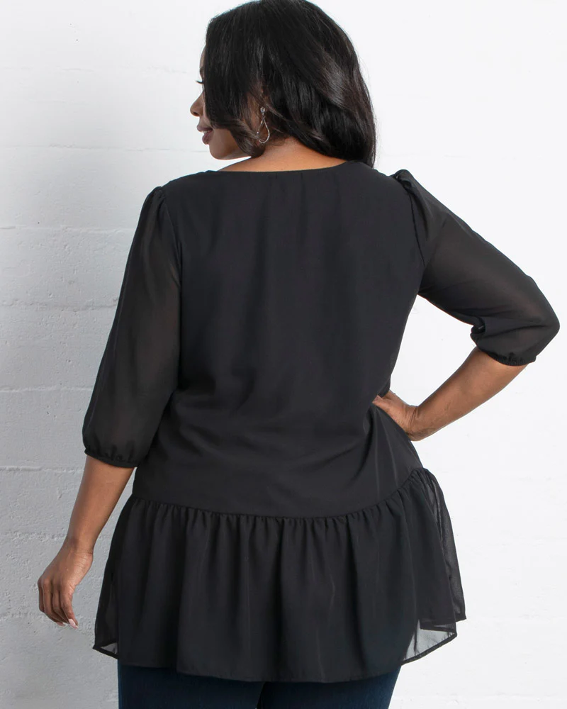 Throw on this delicate chiffon tunic top for a relaxed and stylish look. This high-low A-line top features attractive gathering at the shoulders that continue into a ruched section that cinches the front bodice to create shape. A partial gathered tier at the hem forms a peplum-like effect. Available exclusively in women's plus sizes.