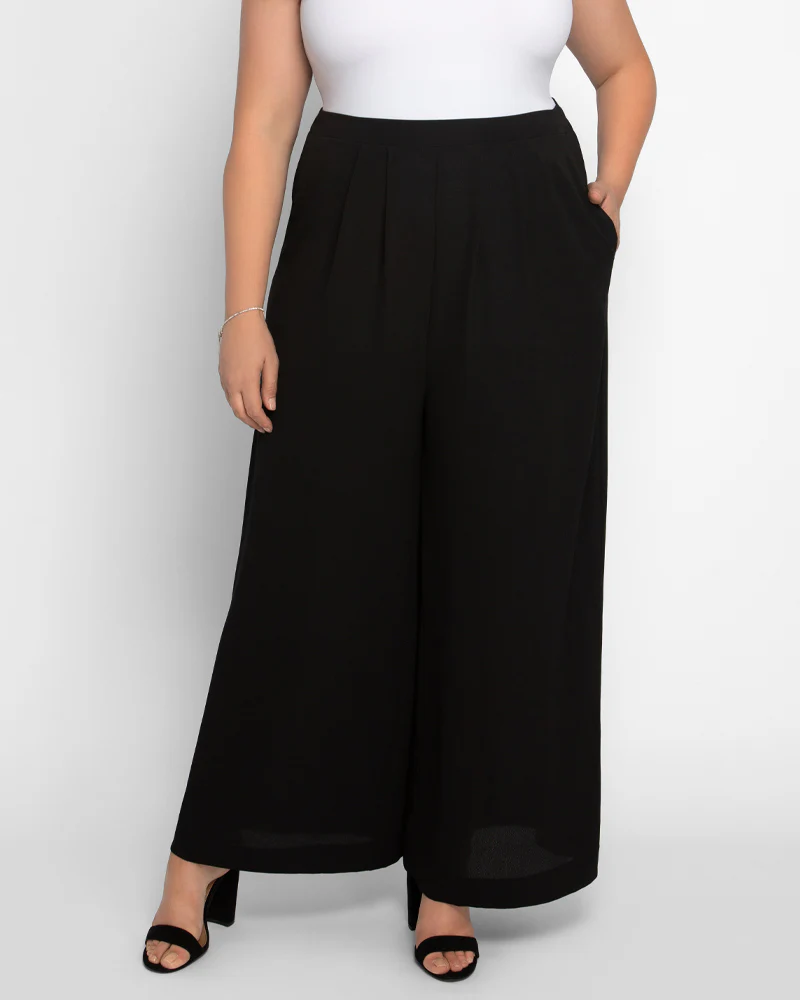 Add flair to your closet with our Coraline Palazzo Pants. Designed with flowy crepe fabric, an elastic back waistband, and pleating at the waist for a comfortable yet flattering fit. Pair it with a tucked in tank top and cardigan for a work-ready look. For special occasions, style your pair with our elegant Linden Lace Top. Available in regular and petite lengths.