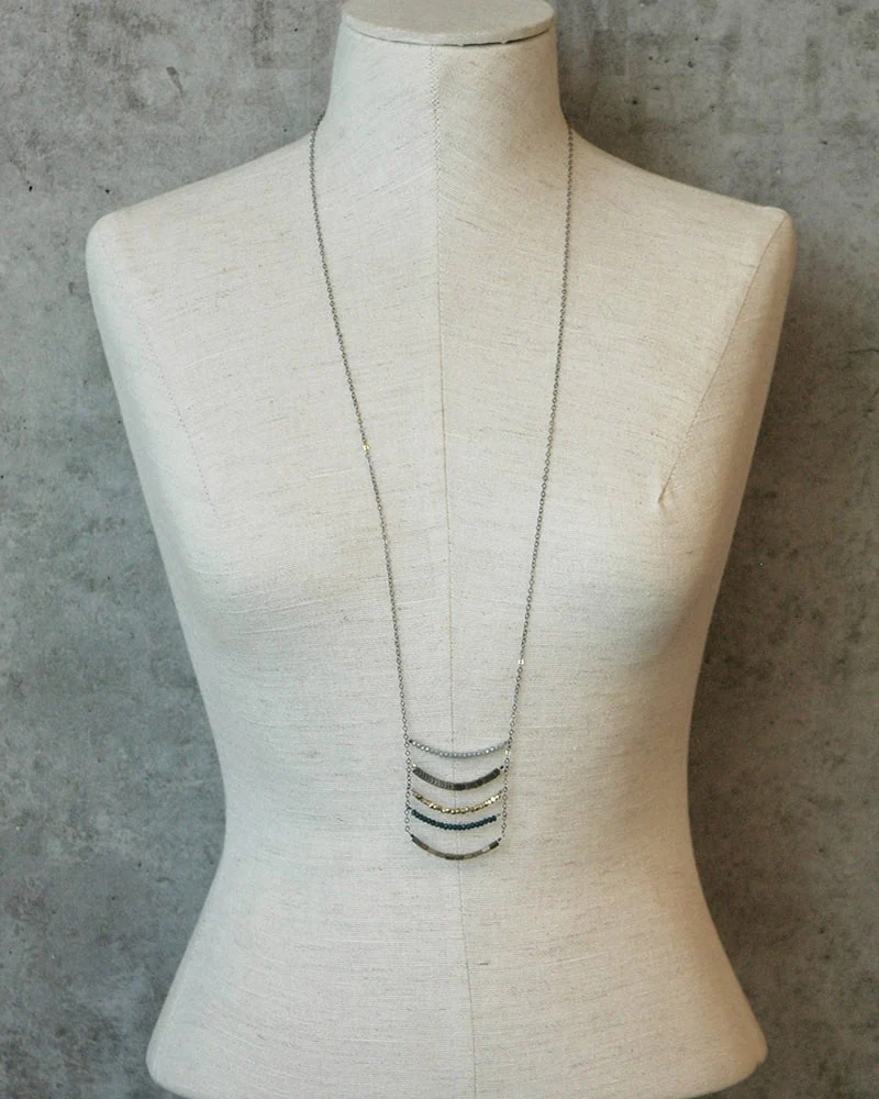 Five is better than one! These layers create the perfect combination of bohemian vibes and classy style. This stack necklace is five layers of glory with India blue beads, blue sage crystals, hematite, and gunmetal toned all on a 36 inch hypoallergenic chain.