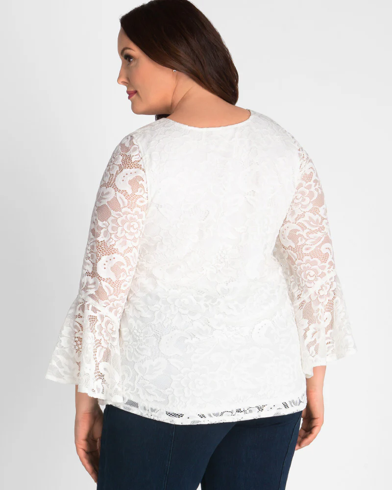 Add a romantic touch to your wardrobe with our Lauren Lace Trumpet Sleeve Top. Feminine floral lace and statement sleeves make this modest v-neck top perfect for the office M-F. On Saturday, pair this plus size long sleeve lace top with your favorite denim for a boho-inspired outfit.
