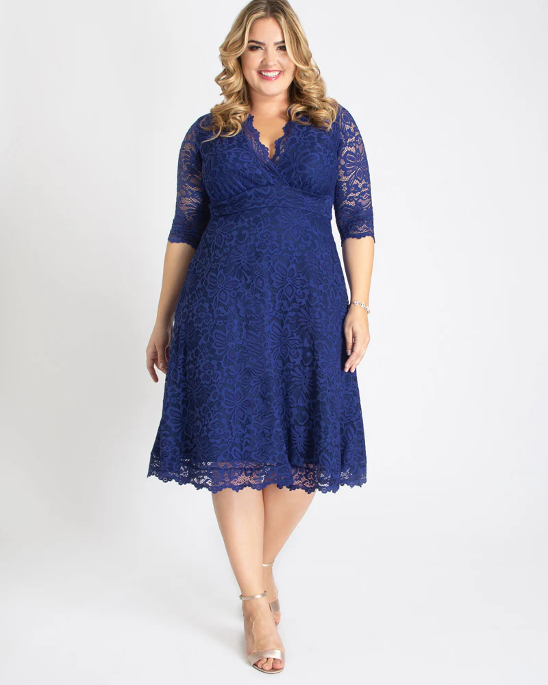 Flatter your curves in our Mademoiselle Lace Cocktail Dress. This special occasion plus size A-line midi dress will have all eyes on you. With gorgeous scalloped lace and a classic fit and flare silhouette, you'll feel exquisite no matter the occasion, day or evening, formal or semi-formal. Perfect for the best dressed wedding guest, that bridesmaid who might just upstage the bride, as well as the beautiful mother of the bride or groom. Our reviewers have turned heads in the Mademoiselle at countless cocktail parties, formal and semi-formal events. This dress is now on sale and available exclusively in women's plus sizes (0x,1x,2x,3x,4x,5x, 12,14,16,18,20,22,24,26,28,30 and 32).