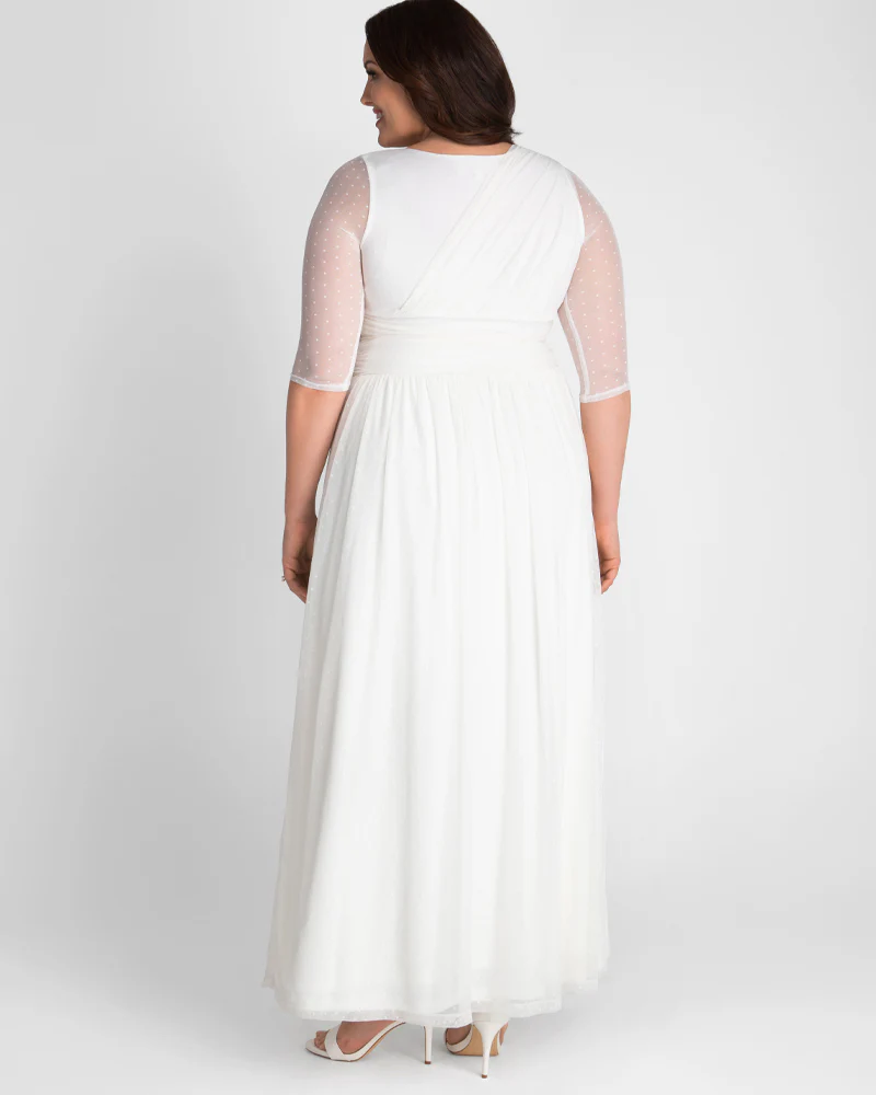 Every bride should look like a gorgeous goddess on their big day. Our plus size 3/4 sleeve wedding dress is designed with a dot mesh that is youthful and eye-catching. Mesh gathering on the right side of this chic wedding gown creates a stunning one shoulder illusion. A flattering gathered waistband and 3/4 length mesh sleeves add a classic touch. Made exclusively in women's plus sizes.