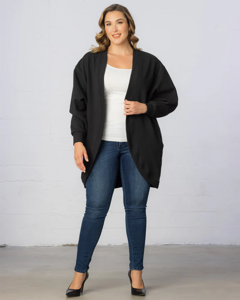 Luxurious faux fur adds an extra layer of comfort to this open-front cardigan, making it an indispensable addition to your cold-weather wardrobe. With its sleek exterior and a plush faux fur lining, this must-have piece combines style with warmth. Handy pockets ensure your hands stay toasty. You can effortlessly pair it with leggings, black or blue denim, and your preferred boots. The oversized design allows for easy layering over your favorite tee, tank, or sweater. This cozy plus-size women's cardigan is perfect for keeping you warm and stylish whether you're lounging at home or running errands.