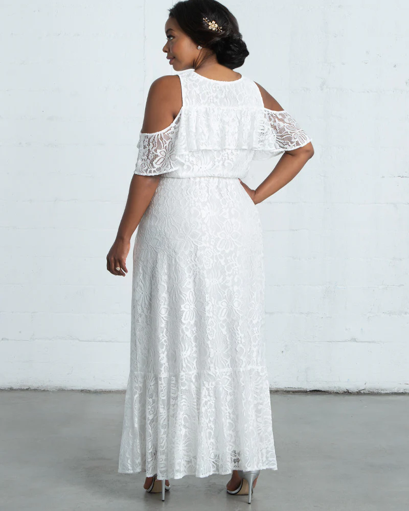 You'll be enchanted by the romantic details of our Savannah Lace Gown. Designed with alluring cold shoulders, flounce sleeves and a flounce at the hem. This gorgeous long dress is perfect for weekend getaways, showers, rehearsal dinners and boho inspired weddings. Stunning floral lace is soft, fully lined, and offers stretch for a comfortable and ideal fit. Made exclusively in women's plus sizes.