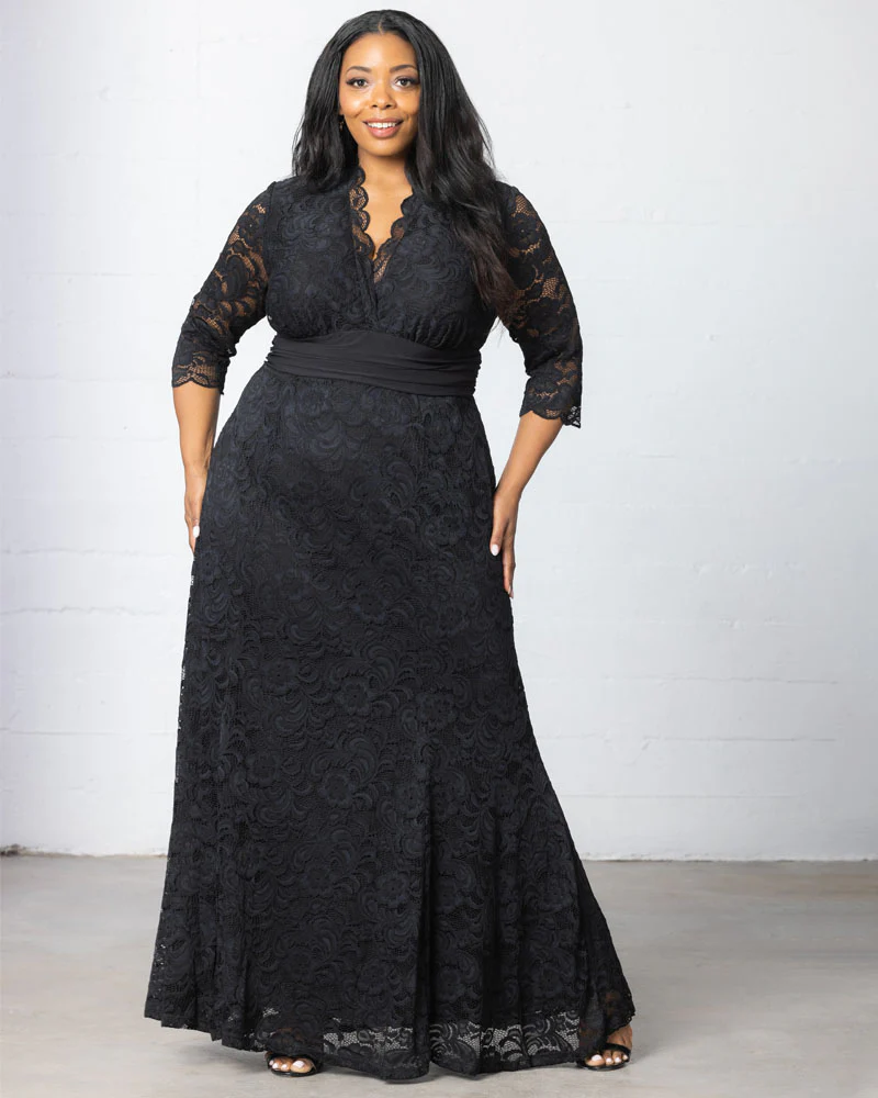 Effortless beauty meets classic style with our Screen Siren Lace Gown. Designed with all-over stretch, this elegant fit and flare evening dress will flatter and accentuate your beautiful curves. A ruched waistband in a contrasting fabric pulls the eye inward to the smallest part of your body and a scalloped neckline and sleeves add that special detailing. This plus size special occasion dress is the ideal formal pick for any black-tie affair. Kiyonna's plus size formal gowns and special occasion dresses are available exclusively in women’s plus sizes.