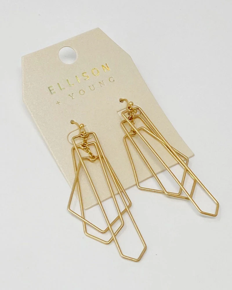 These gold earrings feature an intriguing geometric design with three distinct wired shapes that dangle together, creating a dynamic and dimensional look.