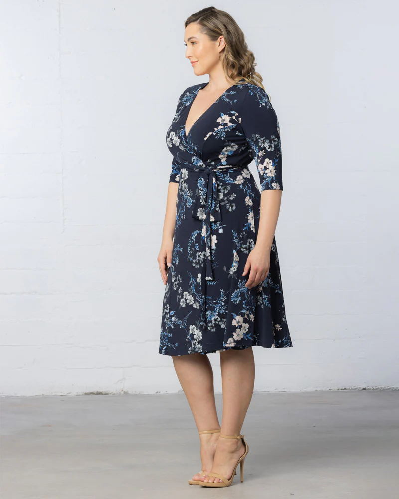 A timeless wardrobe essential, the Signature Print Wrap Dress effortlessly combines classic features flattering princess seams, 3/4 length sleeves, a figure-enhancing wrap-around silhouette, and a gracefully flowing midi or tea-length skirt. This classic printed plus size wrap dress is sophisticated and seamlessly transitions from office to cocktail settings. This true wrap around dress, tailored exclusively for curvy figures, is available in a range of plus sizes (0x,1x,2x,3x,4x,5x, 12,14,16,18,20,22,24,26,28,30, and 32).