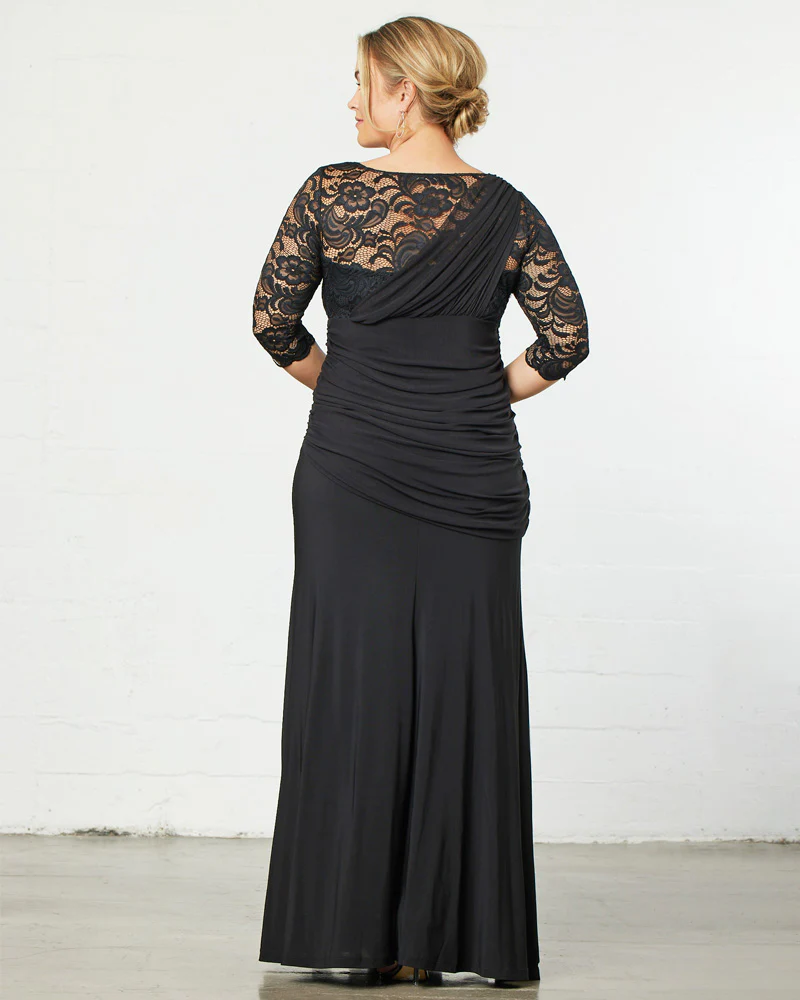 Our Soiree Evening Gown is elegance personified. Delicate mesh gathers over a beautiful scalloped V-neck, giving this dress a unique one-shoulder illusion. 3/4 length sleeves add comfort and a classic touch to this piece of soiree attire. An asymmetrical drop waist and trumpet skirt create a flattering silhouette that accentuates your curves. This formal dress is available exclusively in women's plus sizes.