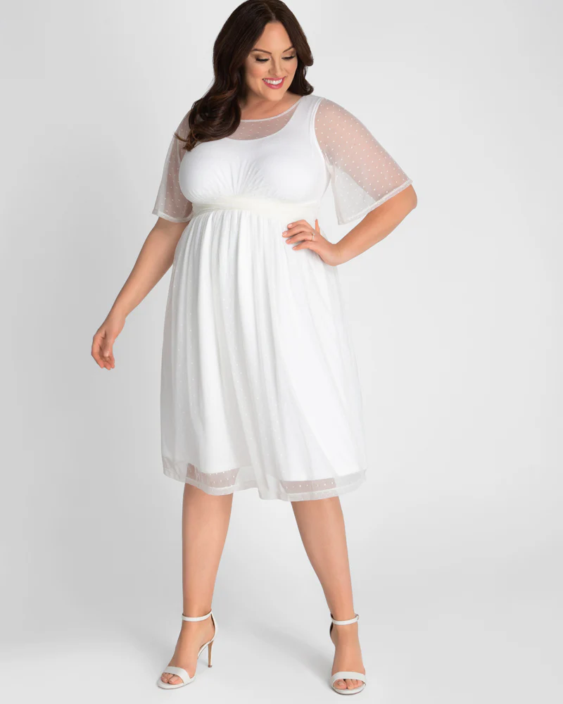 This little white dress features a whimsical dot mesh. A crossover detail at the waist and flutter sleeves will flatter your curves and keep you comfortable. The Stars-A-Line Dress is ideal for any of your special events, showers, rehearsal dinners or backyard weddings. This dot mesh dress is made exclusively in women's plus sizes.