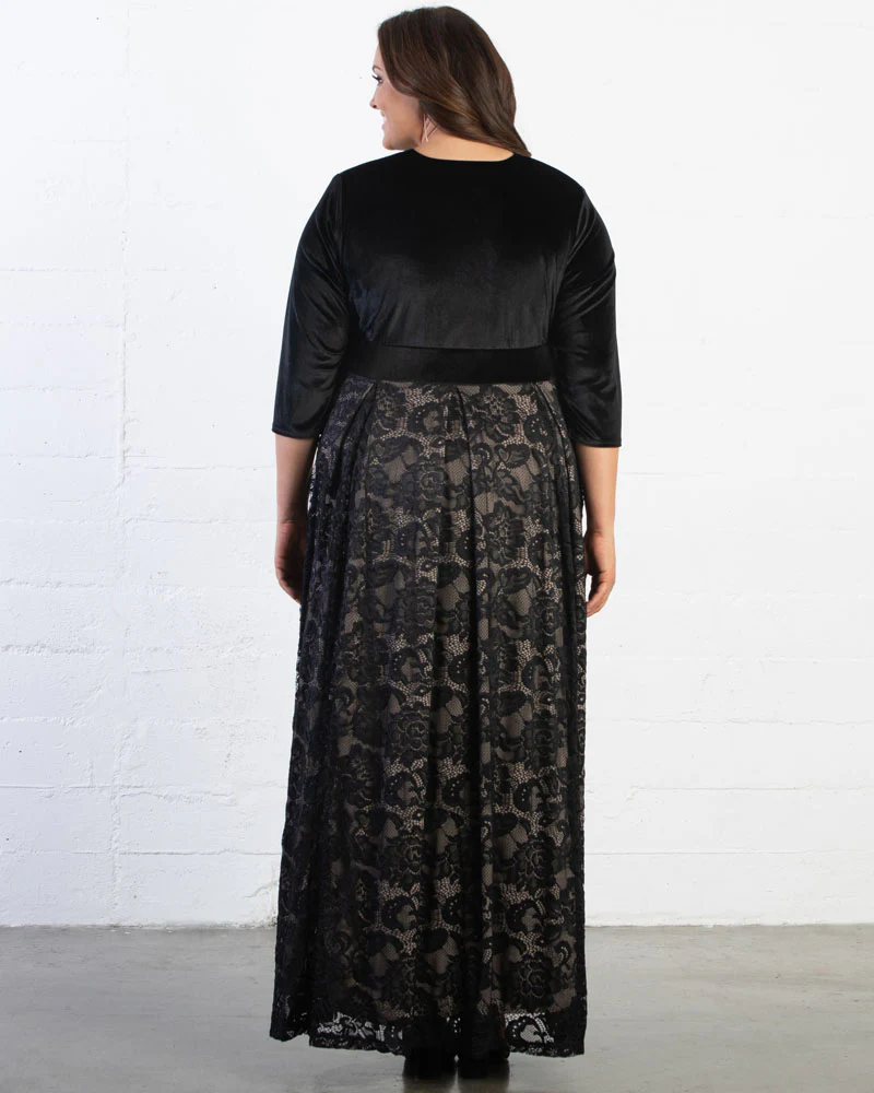 You'll look exquisite in our Victoria Velvet Evening Gown. This stunning and elegant style is designed with a velvet surplice bodice, 3/4 fitted sleeves, and a stunning pleated skirt with lace and contrast lining. A truly regal dress for the inner royal in everyone. Made exclusively in women's plus sizes.